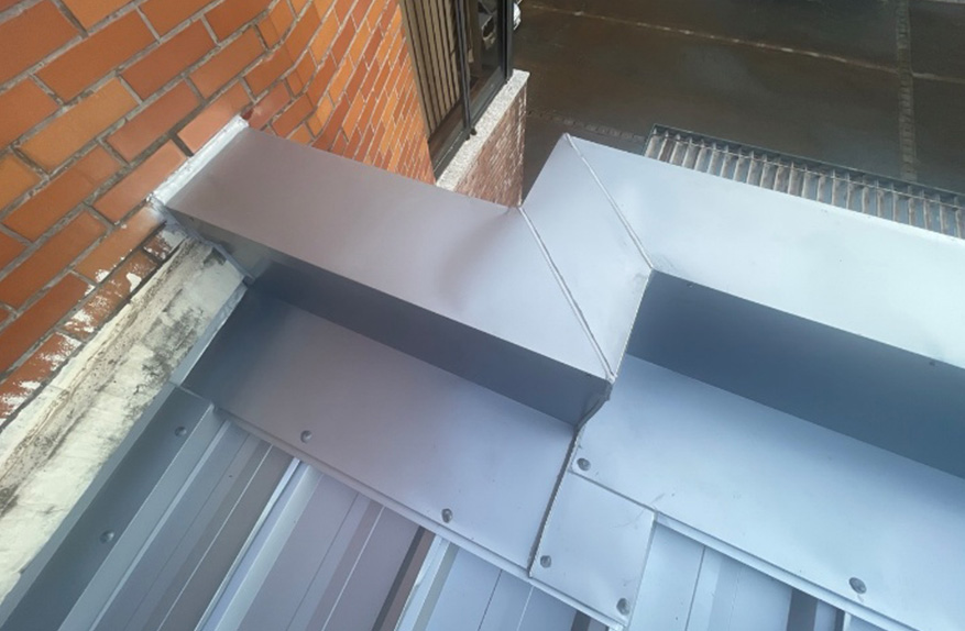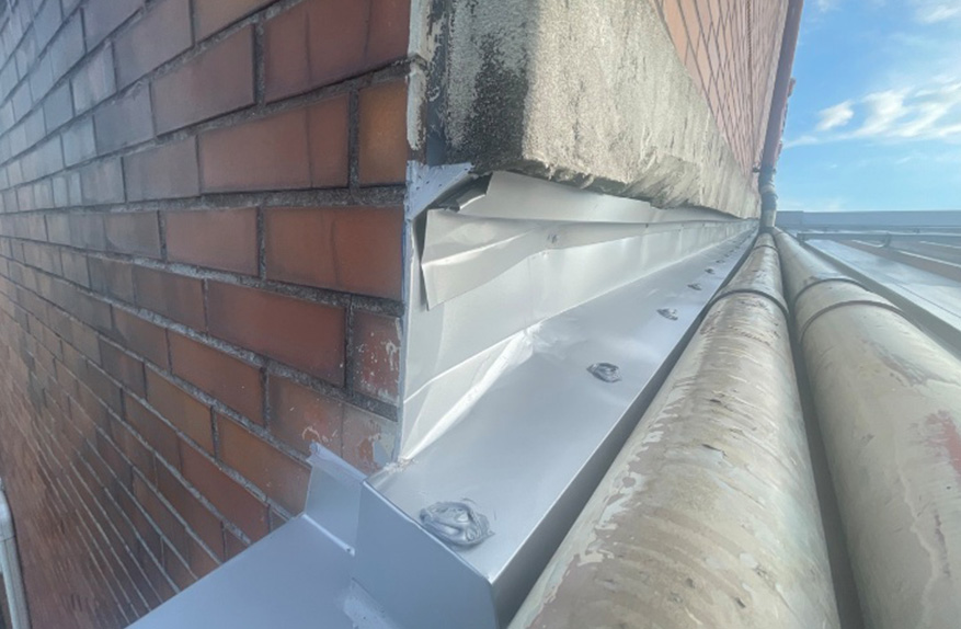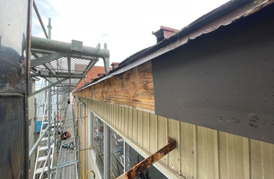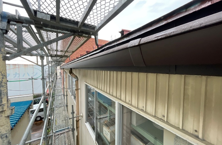 板金で破風板を巻き、新規軒樋(Panasonic製ファインスケア)を取り付けました。