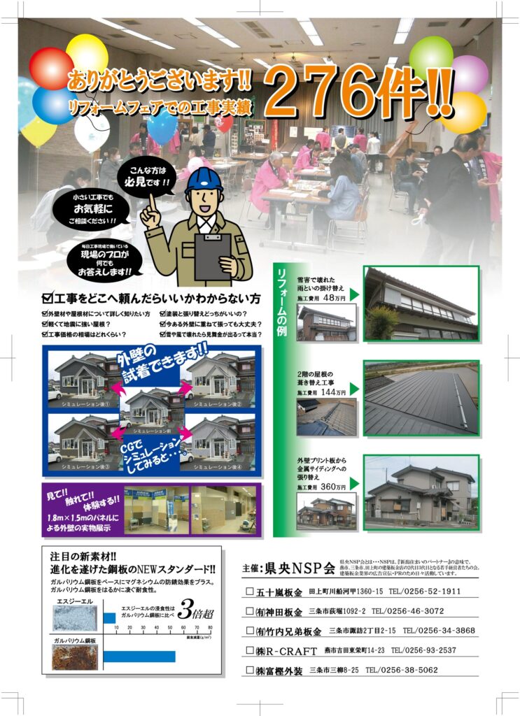 屋根・外壁・雨とい工事を専門とする『富樫外装』も参加いたしますので、お気軽にご来場ください。